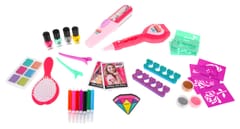 - maszynka do malowania włosów, - sześć cieni do włosów, - szczotka do włosów, - dwie spinki do włosów, - dwa separatory do paznokci, - trzy lakiery do paznokci, - lakier z brokatem do paznokci, - trzy pudełka z brokatem, - pilnik do paznokci, - maszynka do tatuażu, - siedem pisaków do tatuażu, - osiem szablonów do tatuażu, - instrukcja użycia maszynki do włosów i do tatuażu.