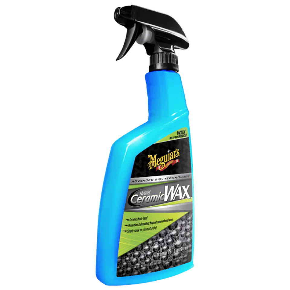Meguiar’s Hybrid Ceramic Wax – wosk stworzony w oparciu o zaawansowaną technologię hybrydową SiO2, która zapewnia łatwą i szybką ceramiczną ochronę lakieru. Po myciu i spłukaniu szamponu, wystarczy nanieść za pomocą atomizera Meguiar’s Hybrid Ceramic Wax na mokry lakier, a następnie ponownie spłukać samochód silnym strumieniem wody. Ostatnie płukanie pomaga rozprowadzić i równomiernie rozłożyć warstwę wosku. Po spłukaniu produktu wystarczy dokładnie osuszyć samochód za pomocą ręcznika z mikrofibry. Produkt nie wymaga polerowania i utwardzania. Pozostawia ceramiczną ochronę o doskonałych właściwościach hydrofobowych, a trwałością przewyższa tradycyjne woski.