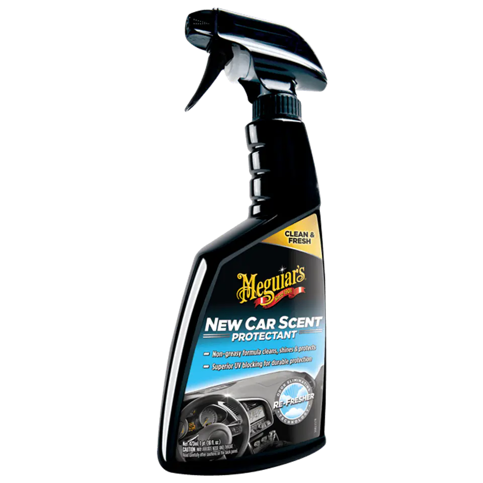 Meguiar’s® New Car Scent Protectant - to uniwersalna formuła, która oczyszcza, nadaje delikatny połysk i chroni wewnętrzne plastiki auta, pozostawiając odświeżający zapach „nowego samochodu”, który nawet eliminuje niepożądane zapachy z wewnętrznych powierzchni. New Car Scent Protectant pomoże usunąć codzienne zabrudzenia i kurz, zapewniając jednocześnie bogaty ciemny i satynowy połysk na powierzchniach winylowych, gumie i tworzywach sztucznych.