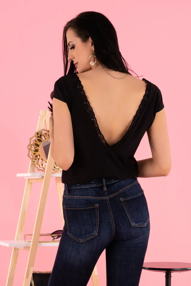 Bluzeczka z krótkim rękawem i dekoltem w serek wykończonym koronką. Z tyłu bardzo głęboki dekolt, także wykończony koronką.
