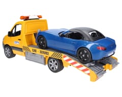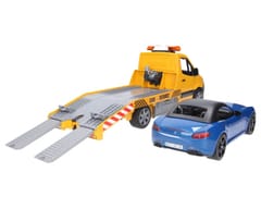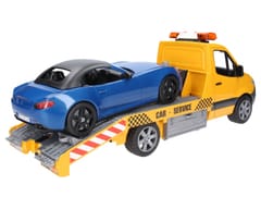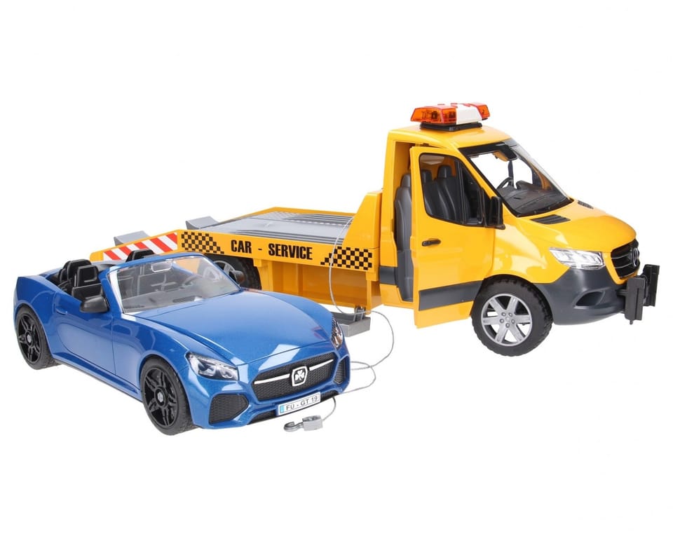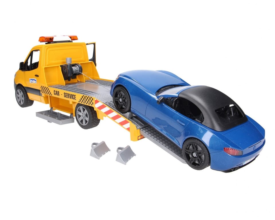 Szykowny i nowoczesny design nowego Sprintera przykuwa wzrok od pierwszego wejrzenia. Transporter samochodowy ma platformę, która w najdrobniejszych szczegółach jest wzorowana na oryginale. Laweta wyposażona jest w moduł świetlno - dźwiękowy a także wciągarkę linową. Dzięki tej wciągarce pojazdy można uwolnić z nawet najtrudniejszych sytuacji. Skrzynki narzędziowe przymocowane z boku służą do przechowywania klinów pod koła, a rampy można również wsunąć bezpośrednio do podwozia. Dołączony BRUDER Roadster ma zdejmowany dach i oferuje miejsce dla każdej figurki bworld. Dla jeszcze większej zabawy pojazd ma zainstalowany nowy system wymiany kół. Zabawka świetnie komponuje się z warsztatem samochodowym firmy Bruder (nr 62110).