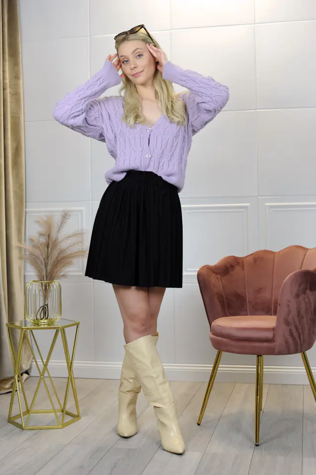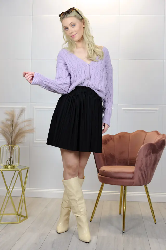 Klasyczna spódniczka w plisy, rozkloszowany fason, na szerokiej gumie w pasie, długość mini. Model ten świetnie pasuje do szpilek oraz do trampek.