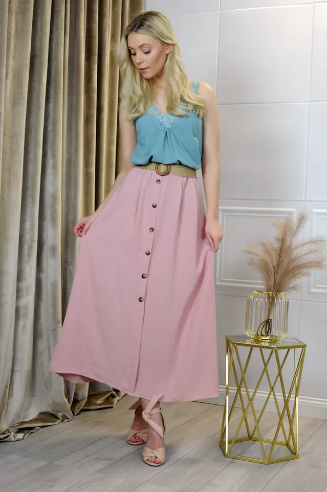 Długa spódnica z gumką w pasie i plecionym paskiem w zestawie. Spódnica z imitacją guzików i rozporkiem z przodu. Doskonała propozycja do pracy, jak również na inne okazje ...