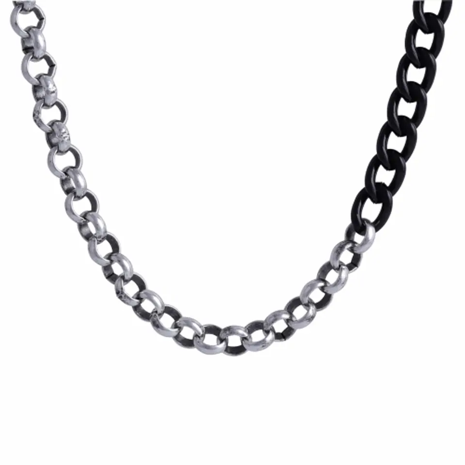 Naszyjnik męski powstały z połączenia dwóch rodzajów grubego łańcucha typu "rolo" i "pancerka" Połączenie dwóch kolorów: Srebra czernionego i czarnego. Naszyjnik zakończony ciekawym, okrągłym zapięciem. Wymiary naszyjnika: 55 cm plus 7 cm przedłużki