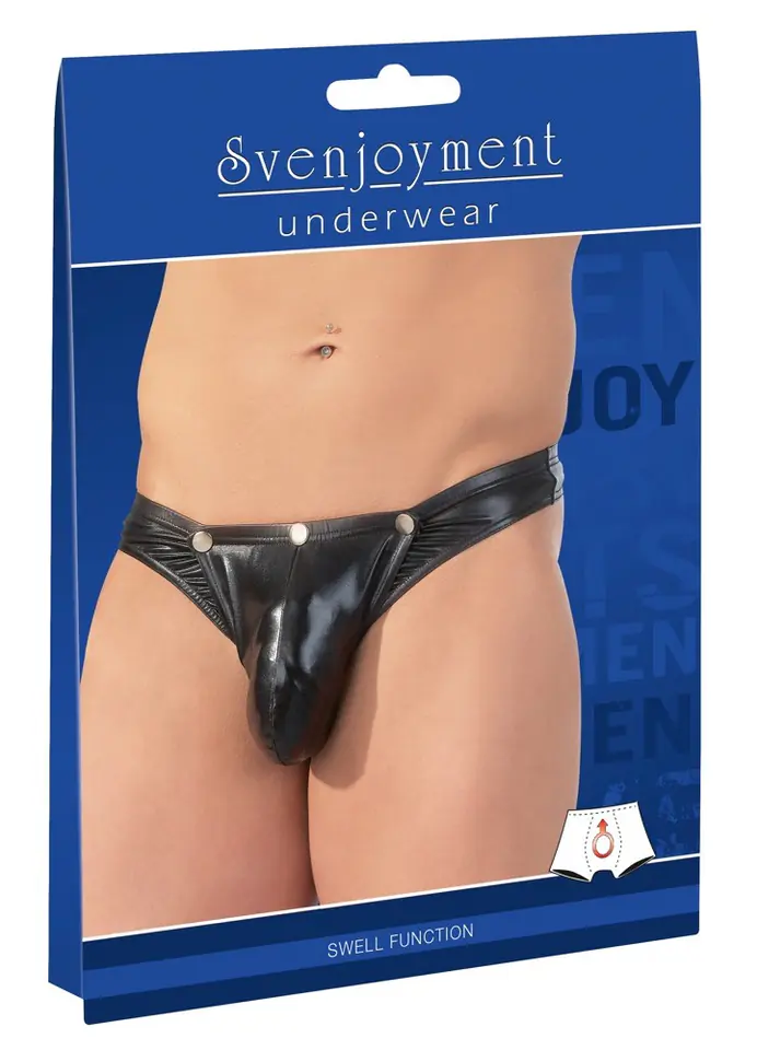 Czarne stringi striptiz w wysokim połysku, sakiewka zapinana na zatrzaski. Materiał: 92% poliester, 8% elastan.