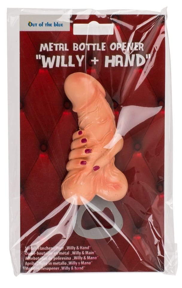 Metal bottle openerDetailed hand-on-penis designWith a practical magnetPerfect for hen/stag nights and theme partiesSaucy gift ideaPerfect for hen/stag nights, theme parties or get-togethers – and as a gag gift!Metal bottle opener Willy + Hand from Out of the Blue with a penis that is firmly gripped by a hand with red fingernails. Very detailed design and carefully coloured. With a practical magnet at the back to fix it to any metal surface (e.g. the fridge).1 piece - 2 hand-on-penis designs – random selection.13 cm long.Polyresin, metal.