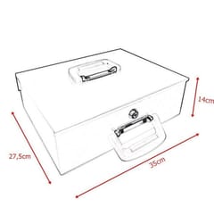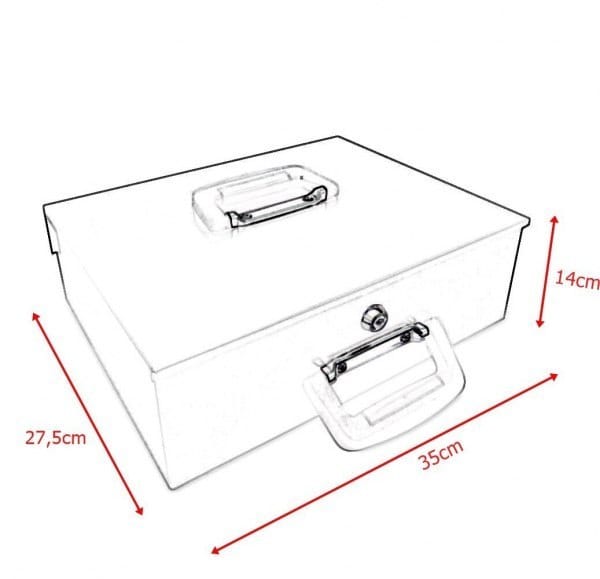 SOLIDNA KASETKA DO TRANSPORTU I PRZECHOWYWANIA GOTÓWKI 35 CMUWAGA - do kasetki pasuje tylko bilon Euro!Fabrycznie nowa, wysokiej jakości metalowa kasetka do przechowywania lub transportu monet, banknotów lub innych wartościowych przedmiotów.Solidna i poręczna walizka z metalu wyposażona w sortownik do monet jest idealnym miejscem do przechowywania banknotów oraz monet. Na dole jest sporo miejsca na przykład na rachunki, paragony, monety, banknoty i inne przydatne przedmioty. Dla bezpieczeństwa kasetka jest zamykana na klucz. Ergonomiczny uchwyt sprawia że transport staje się dziecinnie prosty.WYPOSAŻENIE:- 4 przedziałki na banknoty- Wyjmowana tacka na monety- Wkładka z pianki w pokrywie do mocowaniamonety w czasie transportu- Praktyczny uchwyt do transportu- Dwa klucze w zestawieSKŁAD ZESTAWU: 1x Skrzynka na pieniądze 35cm 2x kluczeDANE TECHNICZNE:Wymiary: 360mm x 275mm x 140mm (Szer/Gł/Wys)Kolor: Jasny SzaryWaga: 4,6kg