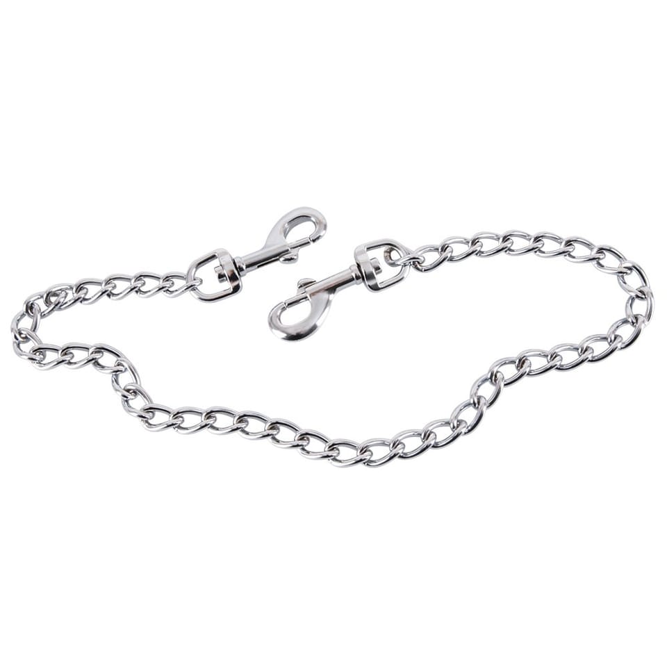 Srebrny metalowy łańcuch z karabińczykami na obu końcach. Łańcuch można zatem przymocować do różnych kajdanek i pasów! Długość 50 cm.