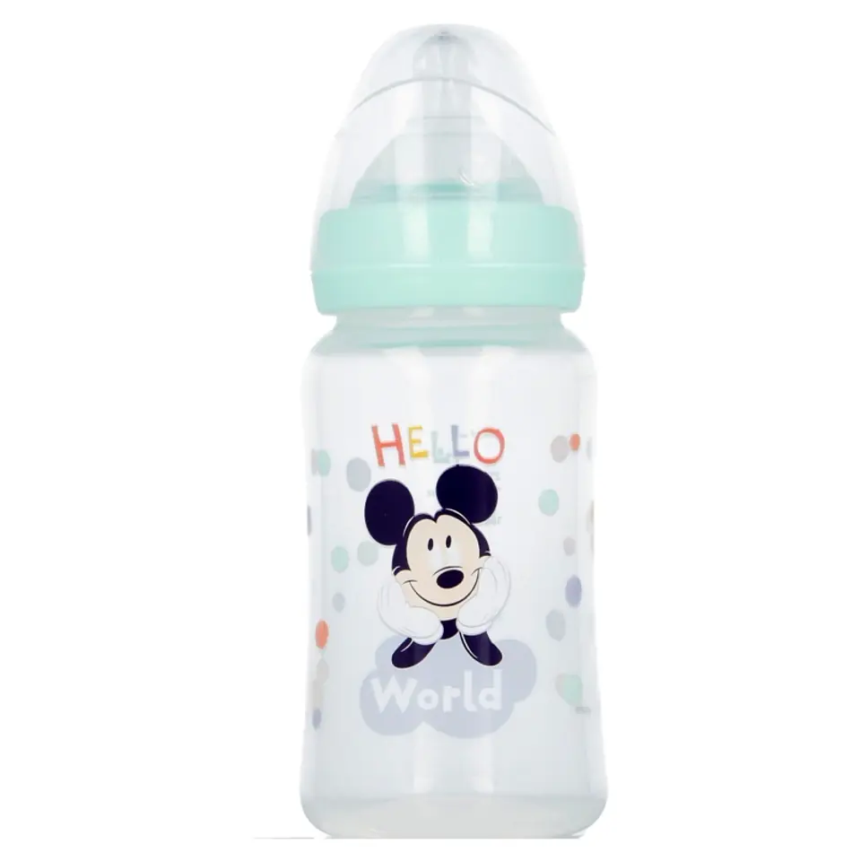 Butelka z poszerzoną szyjką i silikonowym smoczkiem z 3 pozycjami, ozdobiona oryginalnymi i atrakcyjnymi wzorami nawiązującymi do najbardziej znanych dziecięcych postaci.