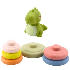 Zestaw składa się z sześciu miękkich okręgów wykonanych z ekologicznych materiałów, z których każdy posiada inną strukturę i fakturę. Różnorodne tekstury dostarczają dziecku zróżnicowanych bodźców dotykowych, stymulując zmysł dotyku oraz ciekawość poznawczą. Układanie elementów jeden na drugim rozwija zdolności manualne, koordynację ręka oko oraz logiczne myślenie. Dodatkowym elementem zabawki jest figurka dinozaura umieszczana na szczycie piramidy, która po naciśnięciu wydaje dźwięk piszczałki, zachęcając dziecko do interakcji.