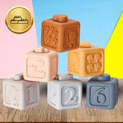 - 6 szt sześciennych klocków z cyferkami i wypustkami ( tylko jeden klocek pasuje do następnego, dziecko uczy się spostrzegawczości) wymiar jednego klocka ok 5 cm x 5 cm