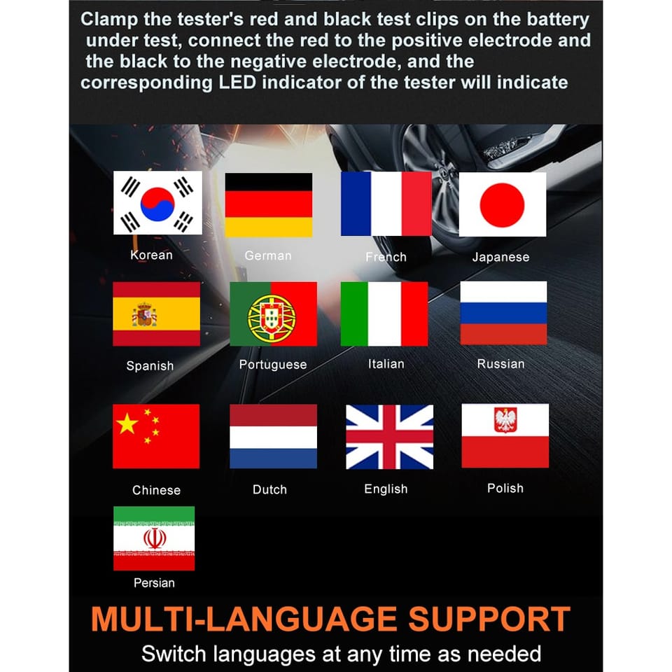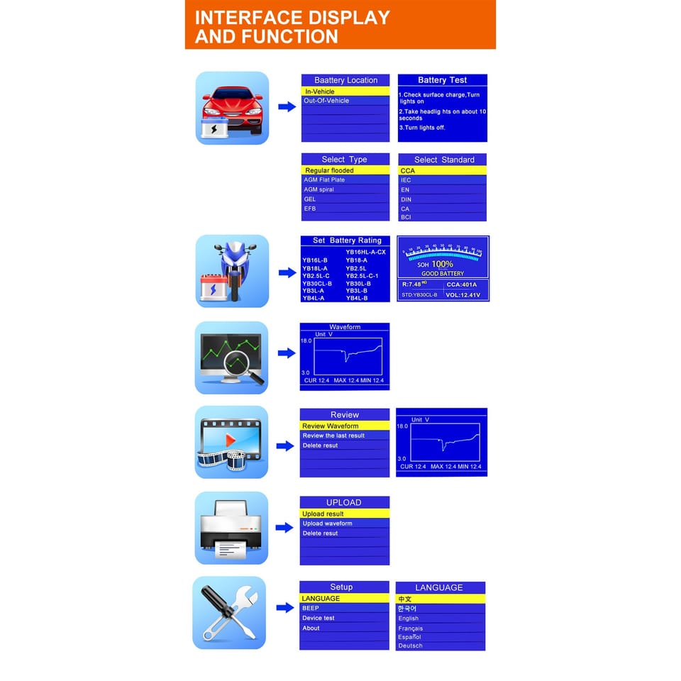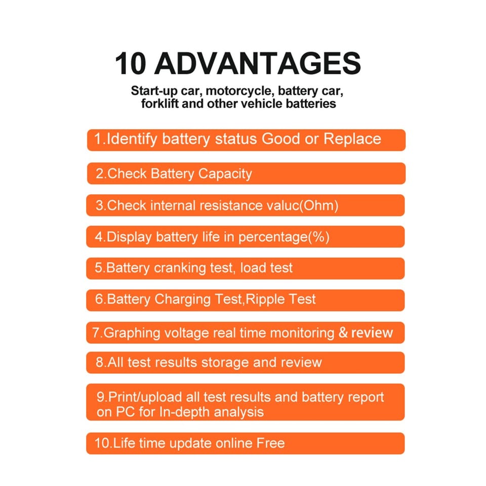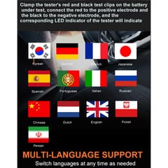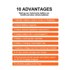 Zakres mierzonego napięcia: 6 – 16 VMierzone parametry: SOC, SOH, rezystancjaZasilanie: z podłączonego akumulatoraWyświetlacz: LCDWymiary: 142 x 80 x 20 mmTemperatura pracy: 0°C~50°CJęzyk interfejsu: angielski, niemiecki, francuski, hiszpański, włoski, portugalski, polski, niderlandzki