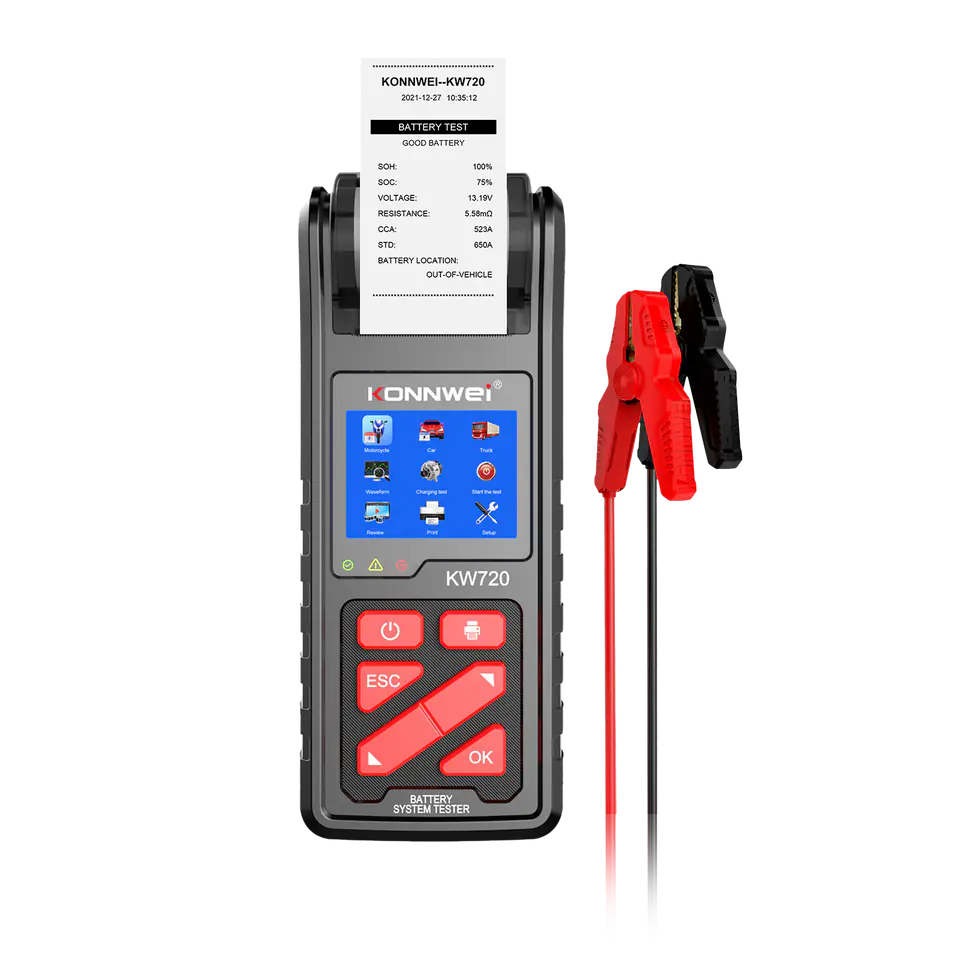 Wbudowana drukarka termicznaZakres mierzonego napięcia: 6 – 24 VObsługiwane rodzaje akumulatorów: AGM, EFB, żeloweZasilanie: z podłączonego akumulatoraWyświetlacz: 3,2’’, LCDTemperatura pracy: 0°C~50°CWymiary: 25,5 x 10,3 x 3,6 cmJęzyk interfejsu: angielski, niemiecki, francuski, hiszpański, włoski, portugalski, polski, niderlandzki
