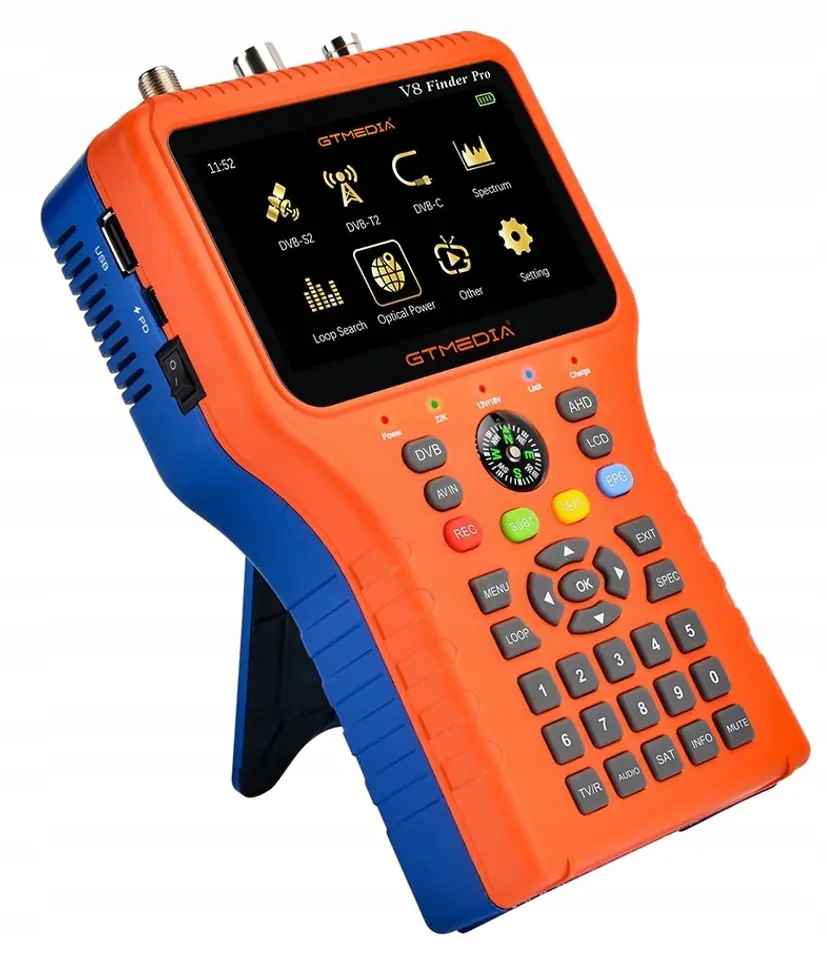 GTMEDIA V8 Finder Pro to miernik typu COMBO do pomiaru sygnałów satelitarnych DVB-S/S2/S2X oraz naziemnych DVB-T/T2/C/ATSC-C w MPEG-2/4 oraz kompresji H.264 / H.265 (10 bit). Kompaktowy rozmiar, niewielka waga, intuicyjny interfejs użytkownika, długi czas pracy baterii i bogaty zestaw funkcji. Miernik posiada wszystkie funkcje potrzebne do wykonywania pomiarów w instalacji cyfrowej telewizji: satelitarnej, naziemnej i kablówki. Dodatkowo bardzo dużą zaletą jest wejście sygnału AHD co umożliwia ustawianie obrazu na kamerach monitoringu.