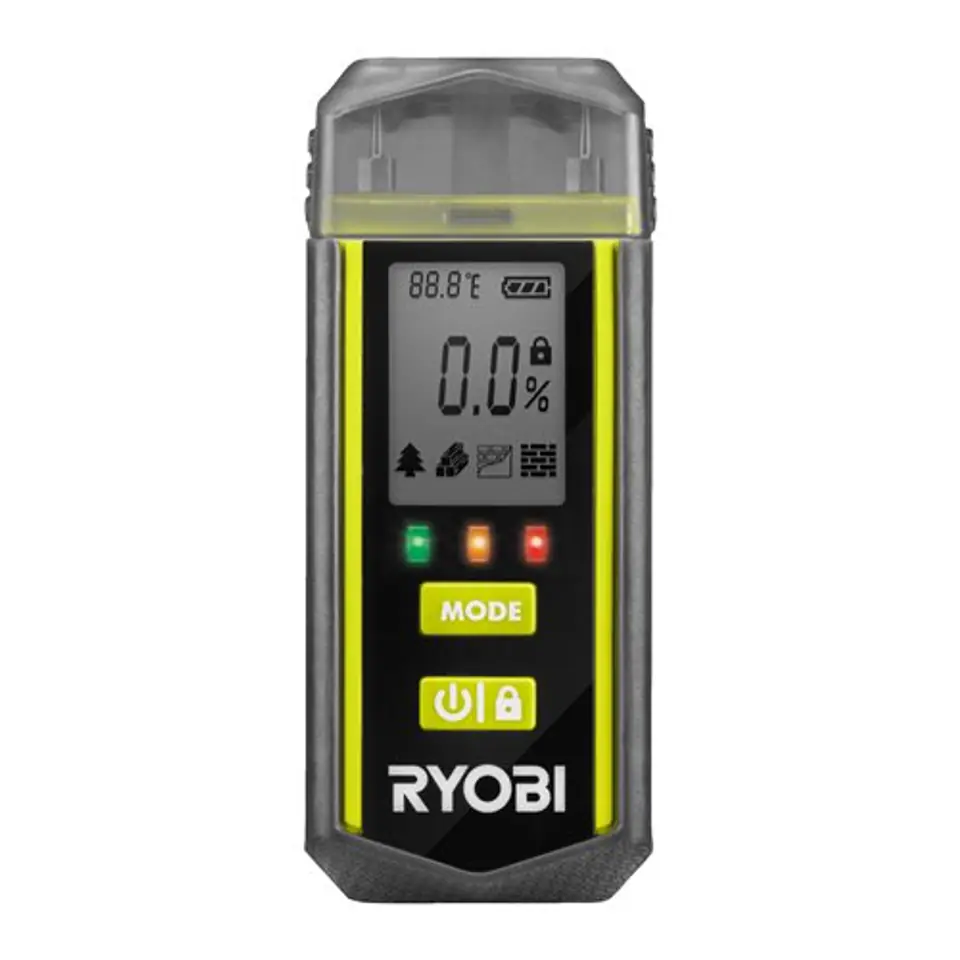Wilgotnościomierz RBPINMM1 RYOBI oferuje cztery tryby wykrywania wilgotności w drewnie iglastym, liściastym, płytach gipsowych i betonie napowietrzonym.