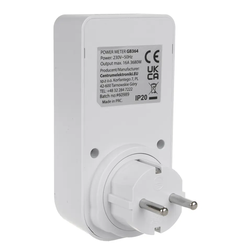 Specyfikacja- Producent: GreenBlue- Model: GB364 F- Typ gniazda: F (schuko) ? stosowane m.in. w Niemczech- Maks. obciążenie: 3680 W- Zasilanie: 220-240 V / 50Hz, 16 A- Zakres pomiaru napięcia: 190 V ? 276 V (dokładność +/- 1%)- Zakres pomiaru prądu 0,001 - 16 A (dokładność +/- 1%)- Zakres zużycia: 0 - 9999,99 kWh- Bateria: 3x 1,2 V Ni-MH- Wymiary: 121x60x77 mm- Stopień ochrony: IP20- Alarm przeciążenia- Zakres temperatury pracy: od 0° do +40°C- Zabezpieczenie przed dziećmi- Kolor: biały