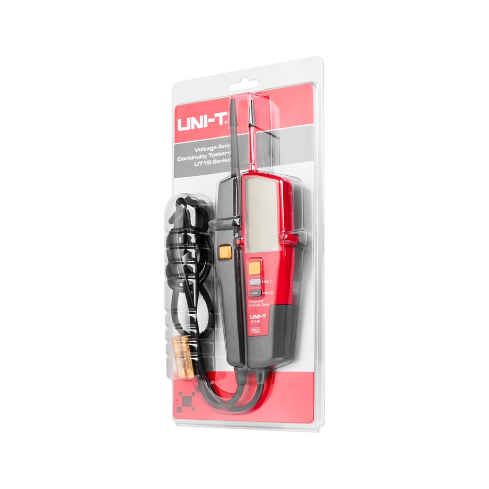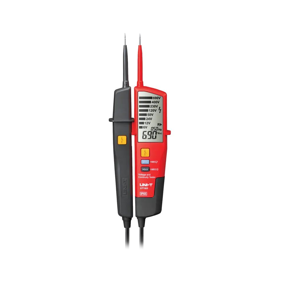 UT18D oferuje szeroki zakres pomiarowy napięcia od 6 V do 690 V z dokładnością ?(1,5%+5). Umożliwia także testowanie ciągłości obwodu do 100 k? oraz detekcję polaryzacji, co zapewnia dokładną analizę stanu elektrycznego. Funkcja testowania RCD oraz automatyczna zmiana zakresów pomiarowych zwiększa jego uniwersalność.