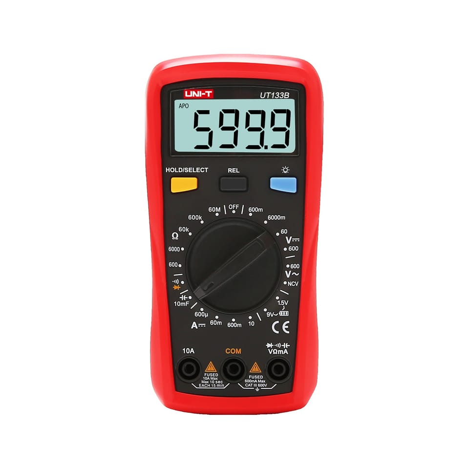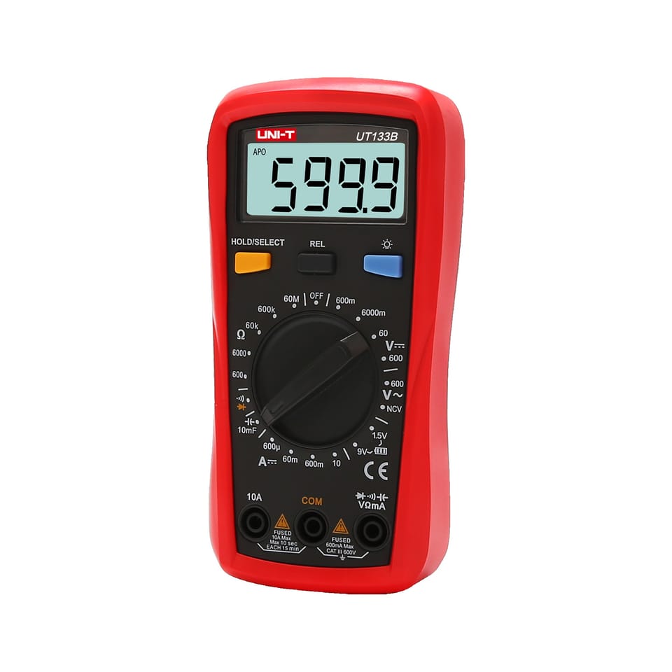 Miernik Uni-T UT133B to jedno z uniwersalnych urządzeń pomiarowych, które umożliwia mierzenie podstawowych wielkości elektrycznych, tj. napięcia stałego lub zmiennego, prądu stałego, a także rezystancji. Ponadto, model pozwala na pomiar pojemności, sprawdzenie ciągłości obwodu, test diod oraz test baterii. Dużą zaletą urządzenia jest także funkcja wykrywania pola elektrycznego.
