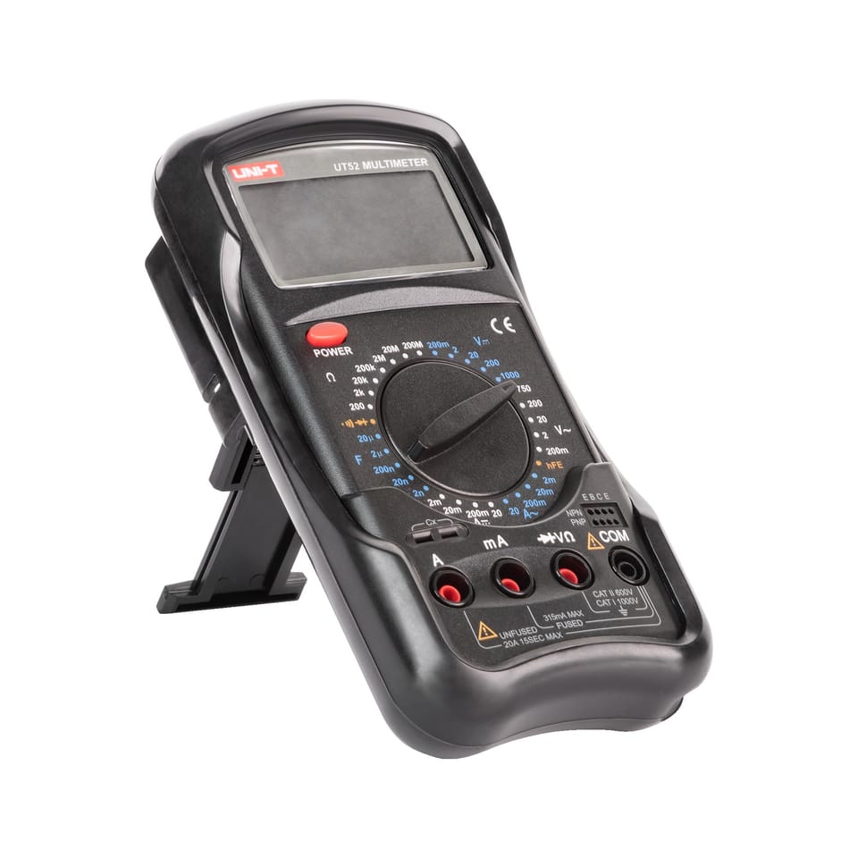 ZAKRESY POMIAROWENapięcie stałe DC: 200 mV / 2 V / 20 V / 200 V / 1000 V ±(0,5%+1)Napięcie zmienne AC: 200 mV / 2 V / 20 V / 200 V / 750 V ±(0,8%+3)Natężenie prądu stałego DC: 2 mA / 20 mA / 200 mA / 20 A ±(0,8%+1)Natężenie prądu zmiennego AC: 2 mA / 20 mA / 200 mA / 20 A ±(1%+3)Rezystancja: 200 Ohm / 2 kOhm / 20 kOhm / 200 kOhm / 2 MOhm / 20 MOhm / 200 MOhm ±(0,8%+1)Pojemność: 2 nF / 20 nF / 200 nF / 2 µF / 20 µF ±(4%+3)Test diodPomiar hFE tranzystorówSprawdzanie ciągłości obwoduDODATKOWE FUNKCJERęczna zmiana zakresów pomiarowych Wskaźnik niskiego poziomu bateriiCECHY OGÓLNEImpedancja wejściowa napięcia stałego: około 10 MOhmZasilanie: bateria 9 V (6F22)Rozmiar wyświetlacza: 33 x 65 mm (3 1 cyfry)Wymiary produktu: 190 x 88 x 34 mmWaga produktu: 560 gAkcesoria: Bateria, przewody pomiarowe, holster