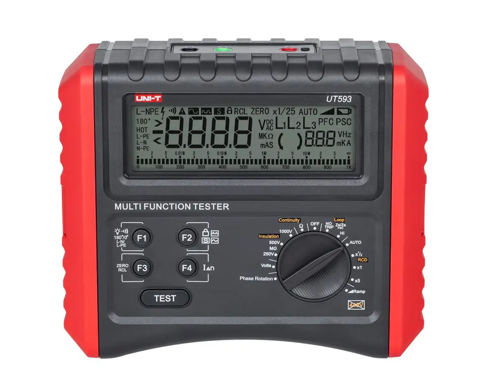 ZAKRESY POMIAROWERezystancja izolacjiDla napięcia probierczego: • 250 V: 0,05 MOhm ~ 250 MOhm ±(5%+5) • 500 V: 0,05 MOhm ~ 500 MOhm ±(5%+5) • 1000 V: 0,05 MOhm ~ 1000 MOhm ±(5%+5)Prąd testujący: 0,9 ~ 1,1 mAPrąd zwarcia: < 1,8 mATest wyłączników różnicowoprądowych RCDNatężenia prądów testujących (In): 10 mA / 30 mA / 100 mA / 300 mA / 500 mANapięcie sieci: 220 V ±10%; 45 ~ 65 HzZakresy czasu wyłączania: • dla 1 In: 0 ~ 2000 ms ±(5%+5) • dla 1 In: 0 ~ 500 ms ±(5%+5) • dla 5 In: 0 ~ 40 ms ±(5%+5)Pomiar natężenia prądu narastającego (rampa)Dokładność natężenia prądu wyłączania: 10%Impedancja pętli zwarcia: Napięcie sieci (L-E): 220 V ±10%; 45 ~ 65 HzNatężenie prądu testującego/czas testu: 20 A/20 ms Zakresy pomiarowe: • 0,05 Ohm ~ 1,99 Ohm ±(5%+5) • 2 Ohm ~ 19,9 Ohm ±(5%+5) • 20 Ohm ~ 2000 Ohm ±(5%+5)Zakres pomiarowy prądu bezpieczeństwa: 0 ~ 26 kA POZOSTAŁE ZAKRESY POMIAROWEMałe rezystancje: 0,01 Ohm ~ 200 Ohm ±(2%+5)Napięcie prądu zmiennego AC : 0 ~ 440 V ±(2%+3)Napięcie prądu stałego DC: 0 ~ 440 V ±(2%+3)Częstotliwość: 20 Hz – 100 Hz (tylko dla celów porównawczych)DODATKOWE FUNKCJE Ręczna/automatyczna zmiana zakresów pomiarowychTest kolejności fazWskaźnik niskiego poziomu bateriiOstrzeżenie o wysokim napięciuPodświetlany ekran LCDBuzzerWyświetlacz pomocniczyMaksymalny odczyt: 9999Funkcja zerowaniaCECHY OGÓLNEZasilanie: 8x bateria 1,5 V (LR6)Wyświetlacz: 125 x 37 mmWymiary: 210 x 175 x 90 mmWaga: 1000 gW zestawie: baterie, przewody pomiarowe, specjalny przewód pomiarowy, końcówki pomiarowe, krokodylki pomiarowe, sonda pomiarowa, etui
