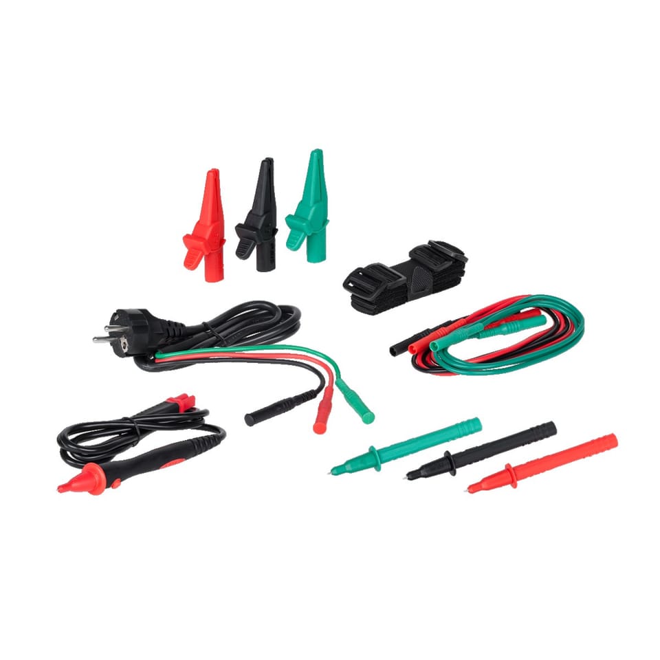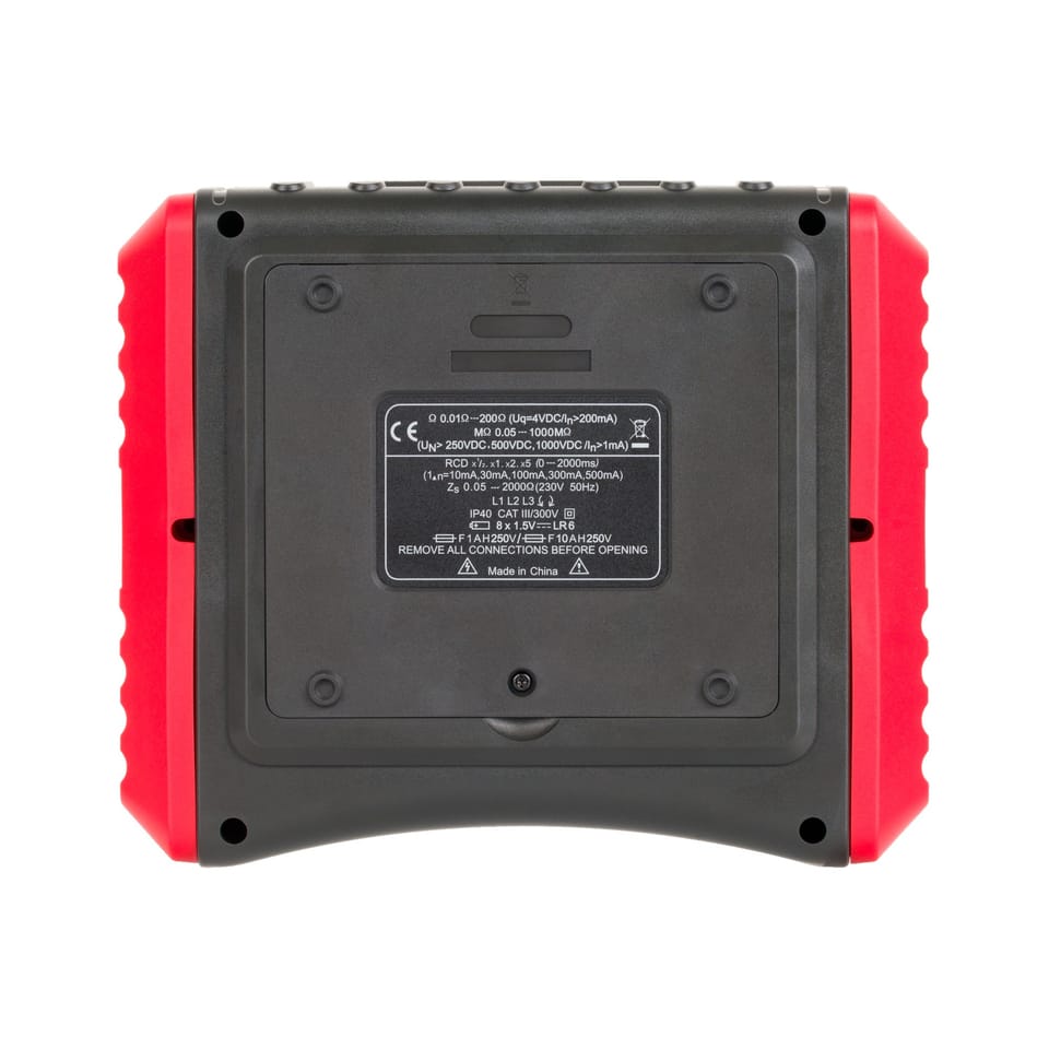 ZAKRESY POMIAROWERezystancja izolacjiDla napięcia probierczego: • 250 V: 0,05 MOhm ~ 250 MOhm ±(5%+5) • 500 V: 0,05 MOhm ~ 500 MOhm ±(5%+5) • 1000 V: 0,05 MOhm ~ 1000 MOhm ±(5%+5)Prąd testujący: 0,9 ~ 1,1 mAPrąd zwarcia: < 1,8 mATest wyłączników różnicowoprądowych RCDNatężenia prądów testujących (In): 10 mA / 30 mA / 100 mA / 300 mA / 500 mANapięcie sieci: 220 V ±10%; 45 ~ 65 HzZakresy czasu wyłączania: • dla 1 In: 0 ~ 2000 ms ±(5%+5) • dla 1 In: 0 ~ 500 ms ±(5%+5) • dla 2 In: 0 ~ 200 ms ±(5%+5) • dla 5 In: 0 ~ 40 ms ±(5%+5) Pomiar natężenia prądu narastającego (rampa)Dokładność natężenia prądu wyłączania: 10%Impedancja pętli zwarcia: Napięcie sieci (L-E): 220 V ±10%; 45 ~ 65 HzNatężenie prądu testującego/czas testu: 20 A/20 ms Zakresy pomiarowe: • 0,05 Ohm ~ 1,99 Ohm ±(5%+5) • 2 Ohm ~ 19,9 Ohm ±(5%+5) • 20 Ohm ~ 2000 Ohm ±(5%+5)Zakres pomiarowy prądu bezpieczeństwa: 0 ~ 26 kA POZOSTAŁE ZAKRESY POMIAROWEMałe rezystancje: 0,01 Ohm ~ 200 Ohm ±(2%+5)Napięcie prądu zmiennego AC : 0 ~ 440 V ±(2%+3)Napięcie prądu stałego DC: 0 ~ 440 V ±(2%+3)Częstotliwość: 20 Hz – 100 Hz (tylko dla celów porównawczych)DODATKOWE FUNKCJE Ręczna/automatyczna zmiana zakresów pomiarowychTest kolejności fazWskaźnik niskiego poziomu bateriiOstrzeżenie o wysokim napięciuPodświetlany ekran LCDBuzzerWyświetlacz pomocniczyMaksymalny odczyt: 9999Funkcja zerowaniaCECHY OGÓLNEZasilanie: 8x bateria 1,5 V (LR6)Wyświetlacz: 125 x 37 mmWymiary: 210 x 175 x 90 mmWaga: 1000 gW zestawie: baterie, przewody pomiarowe, specjalny przewód pomiarowy, końcówki pomiarowe, krokodylki pomiarowe, sonda pomiarowa, etui