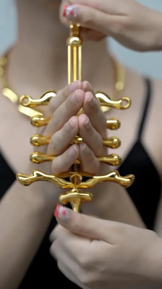 Przedstawiamy tu produkt, który łączy nowoczesność z elegancją – wykonany z wysokiej jakości stopu cynku, pokryty złotą powłoką, by nadać mu luksusowy i wyszukany wygląd. Projekt wyróżnia się pod względem estetyki, a zastosowanie wypukłej, bocznej pokrętnej pokrywy nie tylko dodaje futurystycznego charakteru, ale także podkreśla jego ogólną atrakcyjność wizualną. Ręczne zaciski mają delikatne krzywizny, które idealnie dopasowują się do ludzkiej anatomii, zapewniając komfort i bezpieczeństwo w trakcie użytkowania. Produkt ten pozwala na łączenie różnych narzędzi ograniczających, wzbogacając doświadczenie i poszerzając zakres zmysłowego związania.