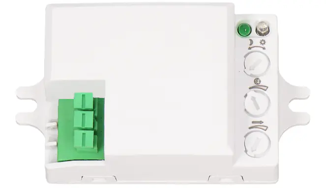 Mikrofalowy (radarowy), małogabarytowy czujnik ruchu jest aktywnym detektorem ruchu, który wysyła fale elektromagnetyczne wysokiej częstotliwości (5,8GHz) i odbiera ich echo. Czujnik wykrywa zmiany w echu, wywołane nawet najmniejszym ruchem w obserwowanym obszarze. Niewielka emisja mocy (<0,2mW), potencjometry do regulacji: czasu świecenia, zasięgu wykrywania ruchu i czułości natężenia światła. Detekcja ruchu przez szkło, tworzywa sztuczne, płyty kartonowo-gipsowe, brak wpływu temperatury na detekcję. Płaska obudowa umożliwia montaż w puszcze podtynkowej ?60 mm. Czujnik współpracuje z oświetleniem LED-owym. Wymiary: 54,5 × 25 × 39,4 mm (szer./wys./gł.)