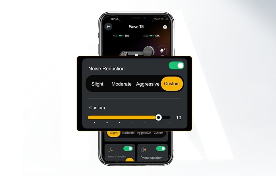 System redukcji szumów działa w oparciu o trzy tryby intensywności (Slight, Moderate, Aggressive) oraz tryb niestandardowy, który można precyzyjnie dostosować w aplikacji MAONO Link. Do Twojej dyspozycji będzie 14 poziomów regulacji, dzięki którym optymalnie dostosujesz tłumienie szumów do warunków otoczenia.