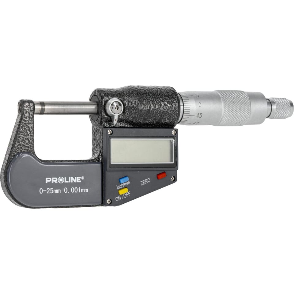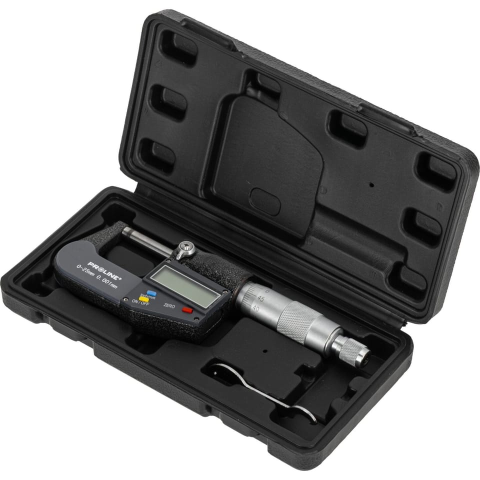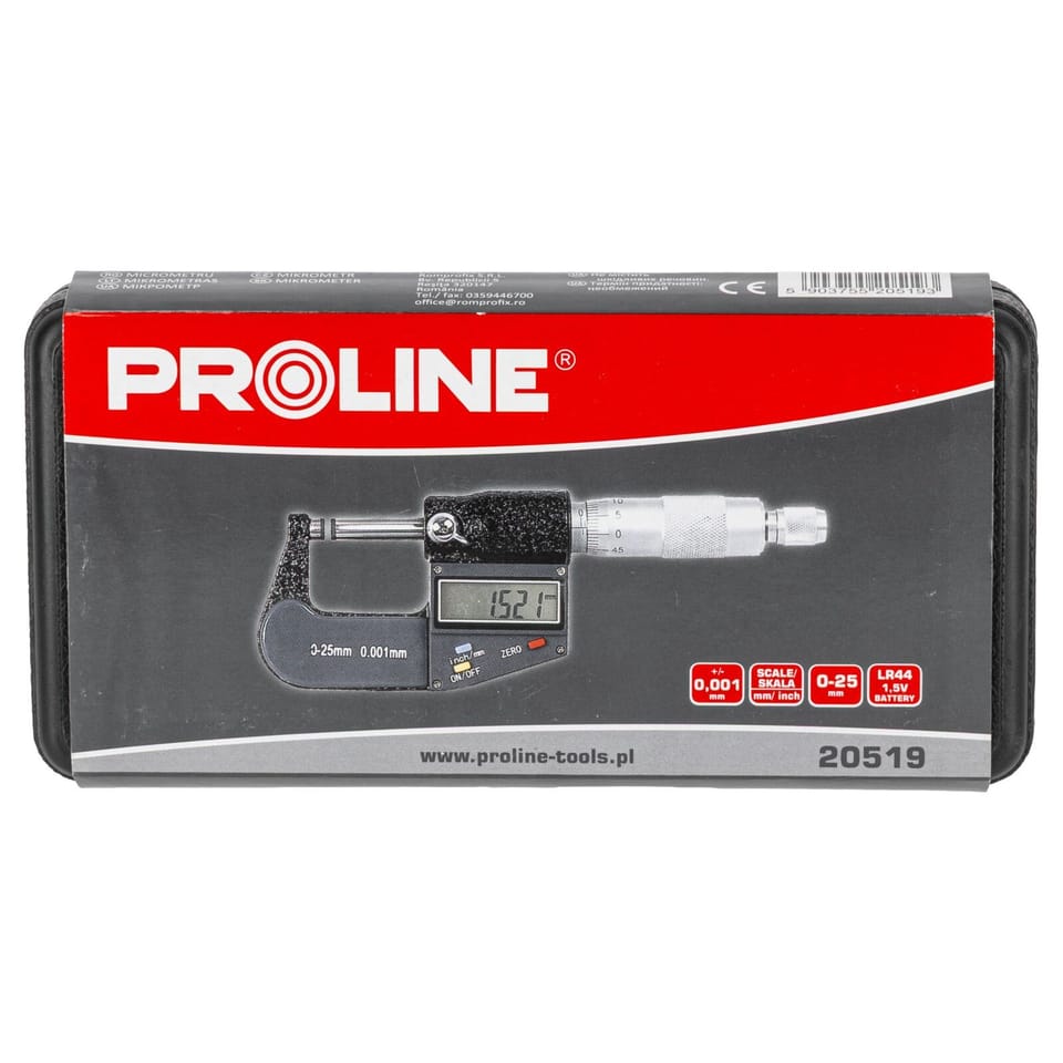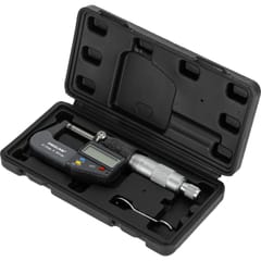 - W zestawie znajduje się mikrometr elektroniczny, kluczyk, bateria, pudełko oraz instrukcja