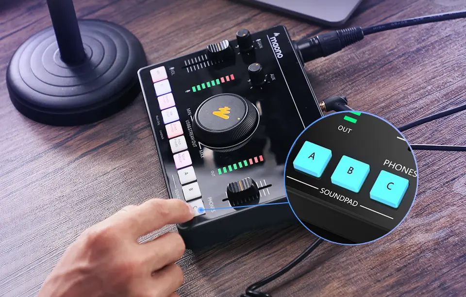 Mikser posiada trzy konfigurowalne soundpady, które pozwalają przypisać dowolnie wgrane dźwięki. To doskonała opcja dla osób, które chcą dodać swoim nagraniom charakteru.