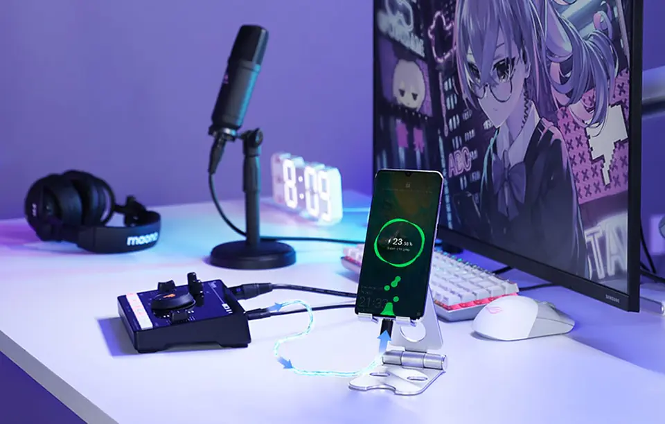 Ten mikser możesz ładować za pomocą powerbanka, ładowarki sieciowej lub podłączając go do laptopa/komputera. Posiada także osobną kontrolę głośności mikrofonu i akompaniamentu oraz wskaźnik poziomu akumulatora, dzięki czemu masz pełną kontrolę nad swoim dźwiękiem.