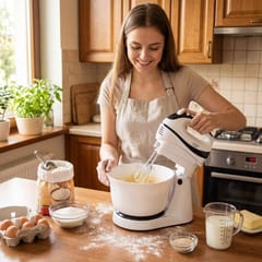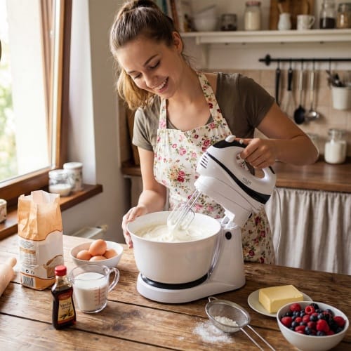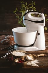 Poręczny mikser kuchenny o mocy 300 W. Niezbędny dla każdej osoby, która piecze ciasta i ciasteczka. Pozwala na wykorzystanie 5 różnych prędkości, w zależności od rodzaju przygotowywanej potrawy. Dzięki temu nadaje się zarówno do mieszania mąki z innymi składnikami, jak i do ubijania jajek. W razie potrzeby można też użyć funkcji Turbo. Robot jest praktyczny i wytrzymały, dzięki czemu można go używać przez długi okres czasu bez ryzyka awarii.Obrotowa misa z napędem nie wymaga od użytkownika trzymania robota w ręku, co sprawia że robot jest wygodniejszy od standardowych modeli.