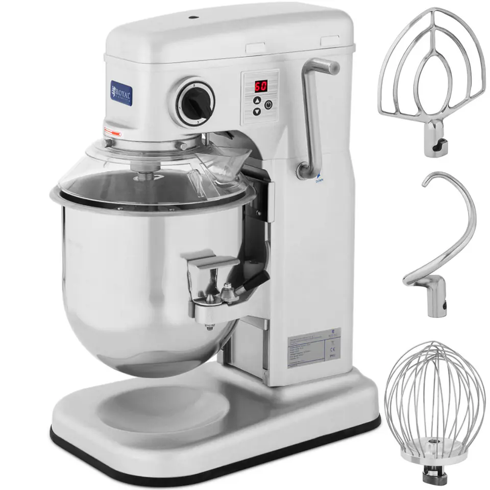 Kod producenta: 10012187Mikser planetarny marki Royal Catering idealnie sprawdzi się w pizzerii, piekarni, restauracji do wyrabiania ciasta na pierogi, pizzę, chleb, makarony oraz inne produkty spożywcze, do wymieszania i zagniatania. Dźwignia z boku obniża misę o średnicy 250 mm. Mikser jednorazowo może przetworzyć do 5,5 kg mąki. Jedno naciśnięcie przycisku uruchamia proces mieszania. Trzybiegowy silnik o mocy 650 W i prędkości 230-580 obr./min z łatwością miesza składniki o każdym stopniu twardości, od bitej śmietany po ciasto chlebowe. Pokrywka zabezpieczająca umożliwia dodawanie składników podczas procesu mieszania bez konieczności wyłączania urządzenia. Obudowa urządzenia wykonana została z aluminium, miska, hak, trzepaczka i płaska ubijaczka wykonane zostały z wysokiej jakości stali nierdzewnej.Cechy produktu: