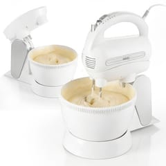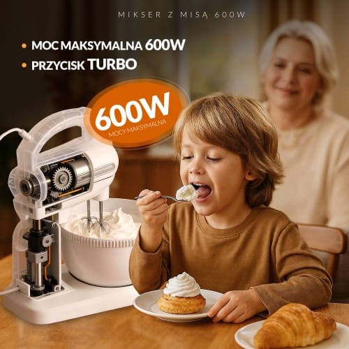 Poręczny mikser kuchenny o mocy 600 W. Niezbędny dla każdej osoby, która piecze ciasta i ciasteczka. Pozwala na wykorzystanie 5 różnych prędkości, w zależności od rodzaju przygotowywanej potrawy. Dzięki temu nadaje się zarówno do mieszania mąki z innymi składnikami, jak i do ubijania jajek, kremów, bitej śmietany. W razie potrzeby można też użyć funkcji Turbo. Robot jest praktyczny i wytrzymały, dzięki czemu można go używać przez długi okres czasu bez ryzyka awarii. Obrotowa misa z napędem nie wymaga od użytkownika trzymania robota w ręku, co sprawia że robot jest wygodniejszy od standardowych modeli.