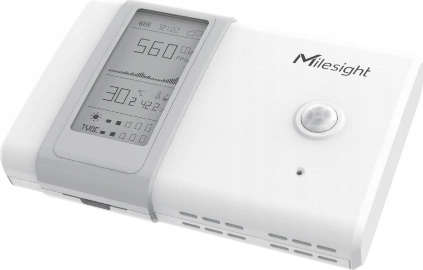 Milesight AM107 Czujnik monitorowania otoczenia wewnętrznego LoRaWAN 7w1 Pomiary: Temperatury Wilgotności Co2 Ciśnienia Ruchu Natężenia Światła TVOC wyświetlacz E-Ink Bateryjny