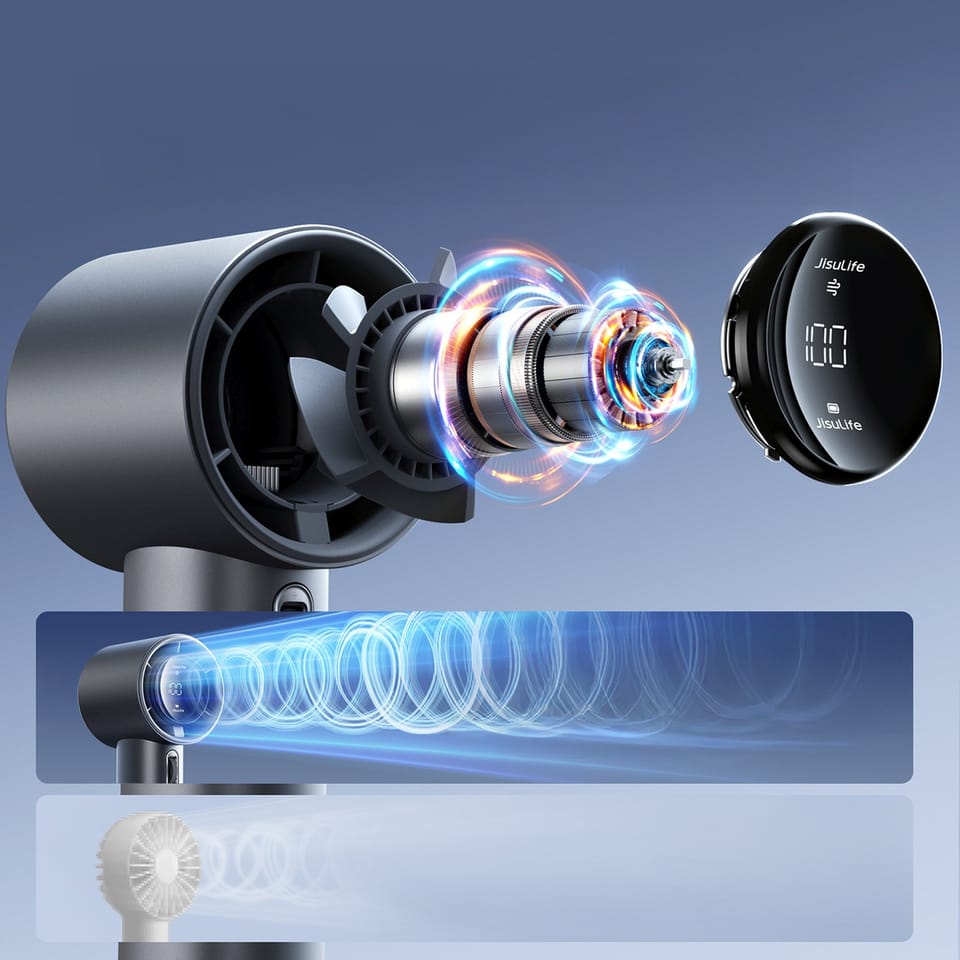 - - Bateria 5000 mAh z szybkim ładowaniem 18 W: Do 15 godzin pracy i błyskawiczne ładowanie w 1,5–2 godziny sprawiają, że wentylator jest zawsze gotowy do działania.
