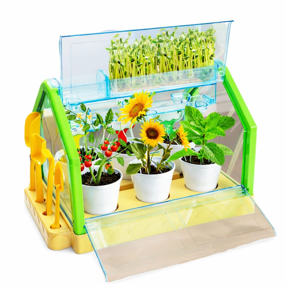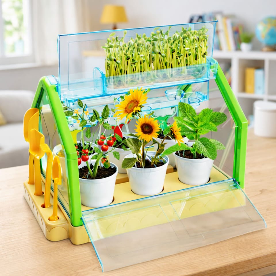Zestaw został zaprojektowany tak, aby dziecko mogło samodzielnie sadzić rośliny, podlewać je i obserwować ich wzrost. Mini szklarnia posiada system automatycznego nawadniania, który pomaga utrzymać odpowiedni poziom wilgoci dla roślin. Dzięki temu młody ogrodnik może łatwo zadbać o swoje sadzonki i zobaczyć, jak rozwijają się w odpowiednich warunkach.