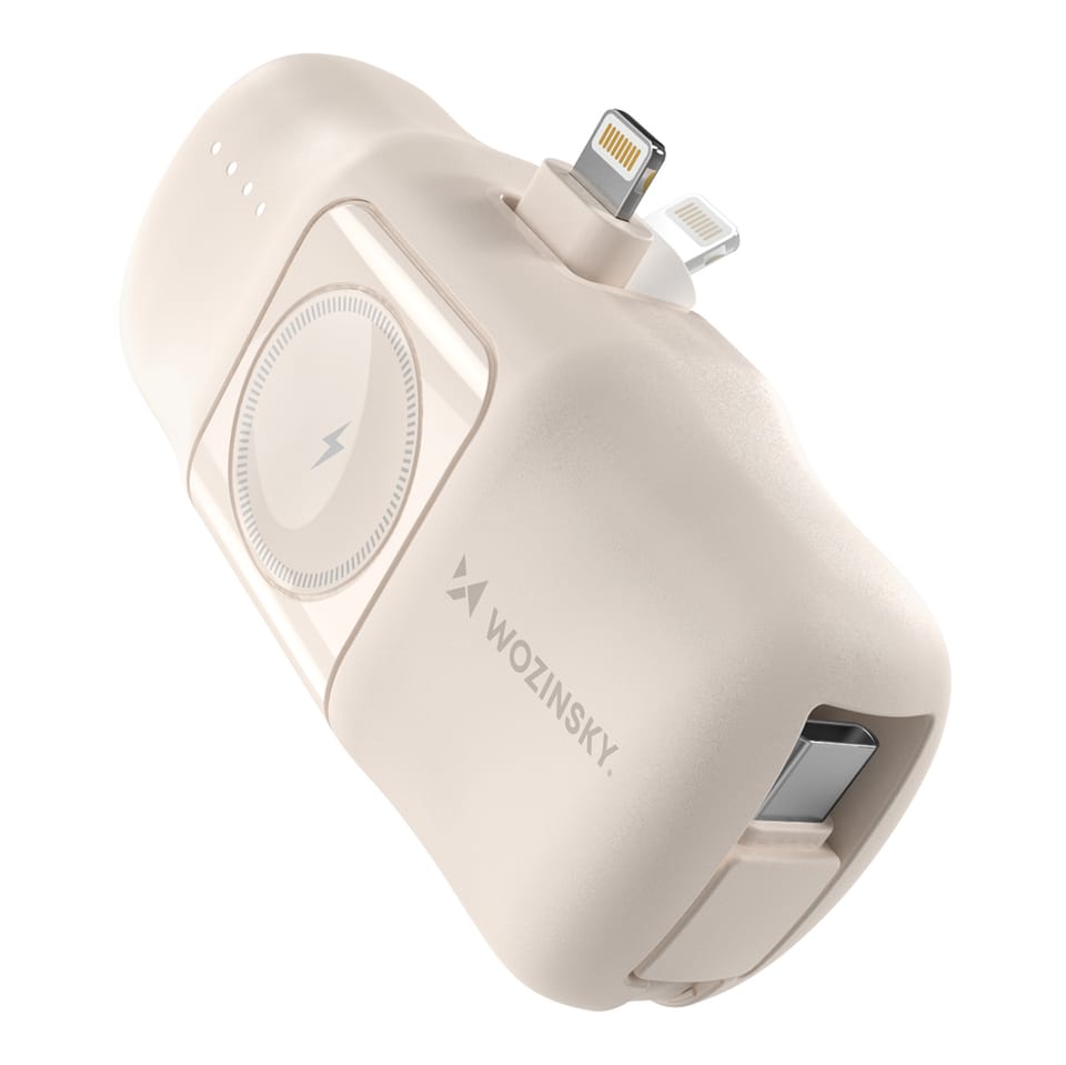 Kod produktu: 1026773Odkryj niezastąpiony Mini powerbank Wozinsky WF16-YLS - idealne rozwiązanie dla tych, którzy potrzebują przenośnego zasilania w kompaktowej formie! Ten wyjątkowy powerbank o pojemności 5000mAh i mocy 15W wyróżnia się nie tylko nowoczesnym designem z miękkimi kształtami, ale także praktycznością. Dzięki wbudowanej wtyczce Lightning oraz kablowi USB-C i funkcji ładowania indukcyjnego dla Apple Watch, jest idealnym wyborem dla użytkowników urządzeń Apple. Niezależnie od tego, czy jesteś w podróży, na spotkaniu, czy na wakacjach, ten powerbank zapewni Ci energię wszędzie, gdzie jej potrzebujesz. Wybierz spośród wielu atrakcyjnych kolorów, w tym klasycznej czerni i bieli, i ciesz się stylowym i funkcjonalnym dodatkiem, który idealnie pasuje do Twojego stylu życia! Wyjątkowy, kompaktowy design, który wyróżnia się na tle innychMini powerbank Wozinsky WF16-YLS przyciąga uwagę swoim unikalnym wyglądem. Jego miękka, zaokrąglona obudowa jest nie tylko stylowa, ale również praktyczna - idealnie mieści się w dłoni lub kieszeni, co sprawia, że jest łatwy do przenoszenia i używania w każdej sytuacji.Wbudowany kabel USB-C dla łatwego i szybkiego ładowaniaJedną z najważniejszych cech tego powerbanku jest zintegrowany kabel USB-C, który eliminuje konieczność noszenia ze sobą dodatkowych akcesoriów. Szybkie podłączenie do smartfona za pomocą kabla bądź wbudowanej wtyczki Lightning pozwala na natychmiastowe ładowanie, co czyni go idealnym rozwiązaniem dla osób w ciągłym ruchu.Indukcyjne ładowanie Apple Watch - wygoda w każdej sytuacjiDzięki wbudowanej funkcji ładowania indukcyjnego, Mini powerbank Wozinsky WF16-YLS sprawia, że Twój Apple Watch zawsze będzie gotów do pracy. To innowacyjne rozwiązanie pozwala na wygodne ładowanie bez konieczności używania dodatkowych kabli, co czyni go idealnym akcesorium dla użytkowników Apple.5000mAh pojemności, która zapewnia zapas energii na długi czasZ pojemnością 5000mAh, ten mini powerbank z łatwością zapewni Twoim urządzeniom wystarczającą ilość energii, abyś mógł cieszyć się nimi bez przerwy. Jest to idealne rozwiązanie, aby uniknąć rozładowania baterii w najmniej oczekiwanym momencie.Szybkie ładowanie o mocy 15W - zawsze gotowy do działaniaFunkcja szybkiego ładowania o mocy 15W sprawia, że Twoje urządzenia są gotowe do działania w krótszym czasie. Niezależnie od tego, czy potrzebujesz szybko naładować smartfona, czy Apple Watch, Mini powerbank Wozinsky zapewnia odpowiednią moc, kiedy jej najbardziej potrzebujesz.Najważniejsze cechy: