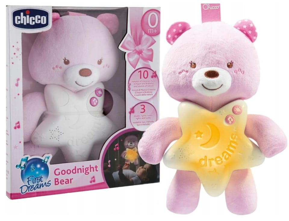 Miś na dobranoc marki Chicco został specjalnie zaprojektowana, aby ułatwić zasypianie każdemu niemowlakowi. Jego brzuszek kryje niezwykłe atrakcje - po naciśnięciu świeci oraz puszcza melodyjki , które będą towarzyszyć dziecku w drodze do krainy snu! Pomogą one maluszkowi się zrelaksować i poczuć bezpiecznie, a dyskretne i spokojne melodie nie będą go rozpraszać.Posiada bogaty wybór melodii, od klasycznych utworów Bacha i Rossiniego, kojących dźwięków natury, po spokojne newage'owe utwory, dzięki czemu Twoje dziecko codziennie do snu może kołysać inna melodia.Całość zapakowana w piękne pudełko - idealne na prezent!Cechy produktu:Bogaty wybór melodii wygrywanych przez 10 minut3 tryby (świeci, świeci i gra, gra)naciśnięcie na brzuszek uruchamia efekty świetlne oraz dźwiękowedo wyboru w dwóch wersjach kolorystycznychWymaga użycia baterii: 3x AAA