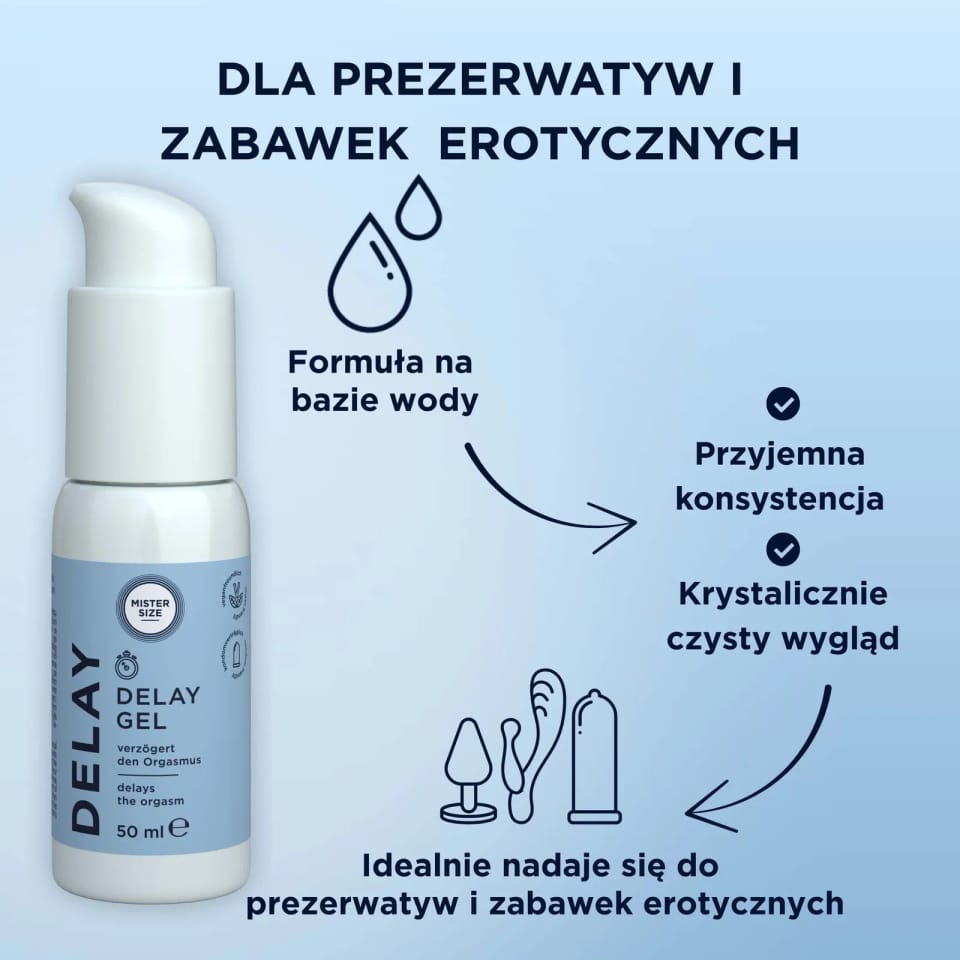 Produkt cechuje się lekką, transparentną konsystencją, ktora nie klei się i szybko się wchłania, zapewniając naturalne odczucie na skorze. Dodatkowo delikatny efekt chłodzenia oraz kojące składniki wpływają na zwiększenie komfortu użytkowania. Mister Size Delay Gel jest kompatybilny z prezerwatywami lateksowymi oraz wyrobami wykonanymi z silikonu, co sprawia, że doskonale sprawdzi się zarowno podczas samodzielnego stosowania, jak i w duecie.