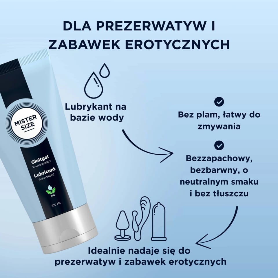 Mister Size Organic jest doskonałym wyborem do zastosowania zarowno z akcesoriami intymnymi, jak i w połączeniu z prezerwatywami. Żel jest całkowicie bezbarwny, bezzapachowy i nie pozostawia trwałych śladow na tkaninach. Praktyczne opakowanie o pojemności 100 ml z zamknięciem typu flip-top umożliwia wygodne i szybkie użycie w każdej sytuacji.
