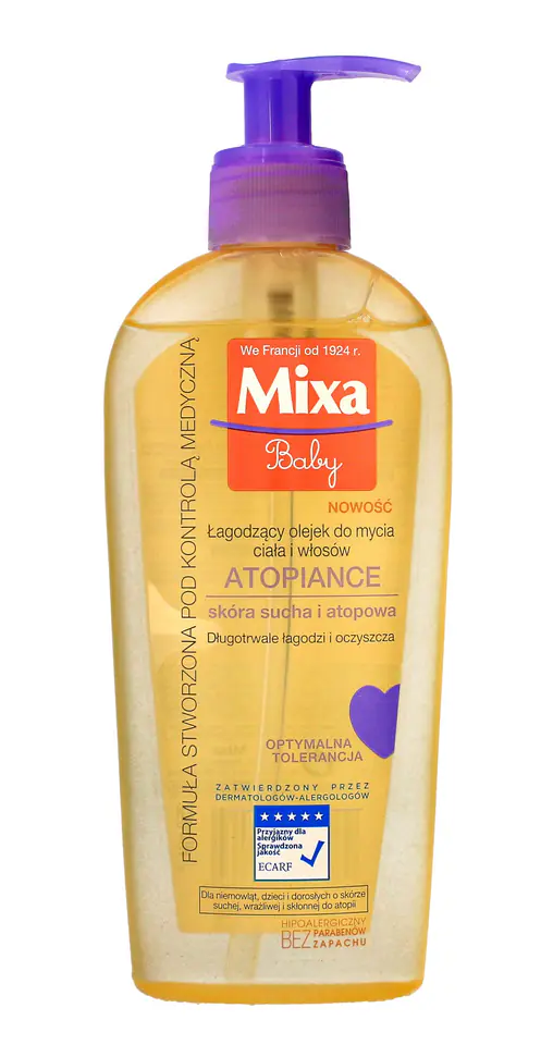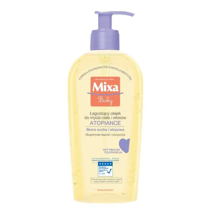 Łagodzący olejek do mycia ciała i włosów ATOPIANCE Mixa o neutralnym pH łagodnie myje ciało i włosy, chroniąc barierę lipidową skóry. Natychmiastowo i długotrwale łagodzi skórę atopową niemowląt, dzieci i dorosłych.