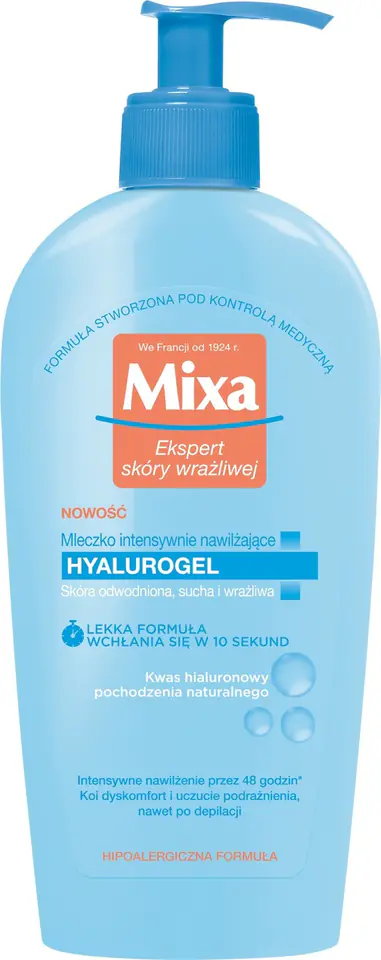 Lekkie mleczko do ciała Mixa HYALUROGEL zostało wzbogacone o kwas hialuronowy pochodzenia naturalnego, który potrafi wchłonąć 1000 razy więcej wody niż sam waży i wzmacnia barierę ochronną skóry ciała. Wchłania się w 10 sekund, pozostawiając suchą i wrażliwą skórę intensywnie nawilżoną przez 48 godzin. Skóra staje się bardziej elastyczna, miękka i odzyskuje uczucie komfortu, pozostaje widocznie odświeżona i gładka, a podrażnienia po depilacji zostają złagodzone. Hipoalergiczna formuła mleczka do ciała HYALUROGEL Mixa powstała pod kontrolą medyczną, a jej skład został opracowany tak, aby zminimalizować ryzyko alergii.