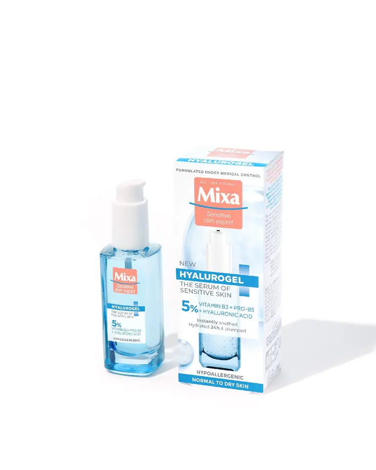 Hyalurogel Serum dla skóry wrażliwej, normalnej i suchej, od Mixa. Produkt zawiera wysokie stężenie składników aktywnych: 5% Witamina B3 + Prowitamina B5 + Kwas Hialuronowy. Serum Hyalurogel łagodzi skórę wrażliwą od pierwszego zastosowania, redukując uczucie dyskomfortu i ściągnięcia. Zapewnia intensywne nawilżenie przez 24h. Po 4 tygodniach skóra jest bardziej miękka, gładsza, wypełniona i wygląda zdrowiej. Serum o świeżej konsystencji szybko się wchłania i się nie klei. Formuła stworzona pod kontrolą medyczną. Hipoalergiczny. Nie zatyka porów.