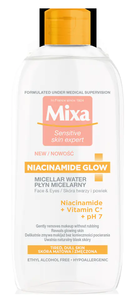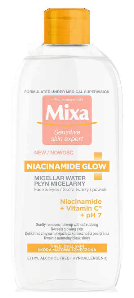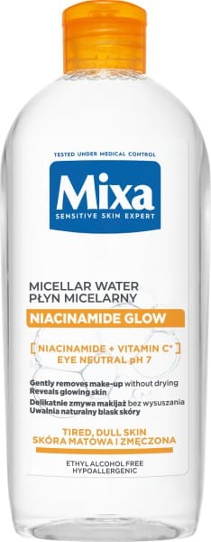 Płyn micelarny Niacinamide Glow przeznaczony jest dla cery zmęczonej i matowej. Formuła zawiera niacynamid i witaminę C*,które mają właściwości rozświetlające i niwelujące oznaki zmęczenia i szarość cery.Zawartość miceli usuwa makijaż i wszelkie zanieczyszczenia.