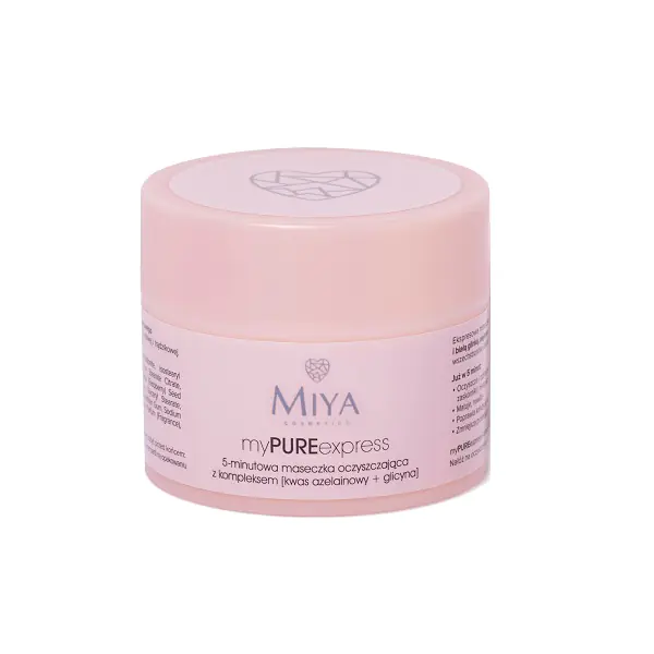 Miya Cosmetics My Pure Express 5-minutowa maseczka oczyszczająca 50g (P1)5906395957354myPUREexpress5-minutowa maseczka oczyszczająca z kompleksem lsqb5% kwas azelainowy + glicynarsqbEkspresowe oczyszczenie porów i skuteczne działanie na widoczne problemy skórne, już w 5 minut.Delikatna, przyjemna i szybka w użyciu, łatwo się zmywa i nie pozostawia uczucia ściągnięcia skóry.Formuła znbspkompleksem lsqb5% kwasnbspazelainowy + glicynarsqb, różową i białą glinką, olejkiem z nasion malin inbspjojoba, witaminą E i prowitaminą B5.Już ponbsp5 minutach oczyszczanbspinbspodblokowuje pory skórne, zaskórniki i niedoskonałości. Matuje, nawilża i poprawia kondycję skóry, zmniejsza przetłuszczanie skóry tłustej.Rezultaty:*97%nbsposób potwierdziło, że ich skóra i pory są oczyszczone z codziennych zanieczyszczeń*95%nbsposób potwierdziło, że skóra była matowaPrzy regularnym stosowaniu 2 razy w tygodniunbspwyraźnie zmniejsza widoczność porów, zaskórników i niedoskonałości.nbspPrzeciwdziała powstawaniu nowych, reguluje wydzielanienbspsebum.Rezultaty:*95%nbsposób potwierdziło, że odblokowuje pory i zmniejsza ich widoczność*95%nbsposób potwierdziło, że rozjaśnia skórę i nadaje jej zdrowy wygląd92,9% składników pochodzenia naturalnego0% zbędnych dodatków. Bez silikonów, parafiny, PEG-ów, olejów mineralnych, parabenów.nbspZobacz pełny składPrzebadana dermatologicznie. Odpowiednia dla wszystkich typów skóry, także wrażliwej i trądzikowej. Nie zapycha porów. Testowana dermatologicznie.nbspNietestowananbspna zwierzętach.nbspWegańska.nbsp