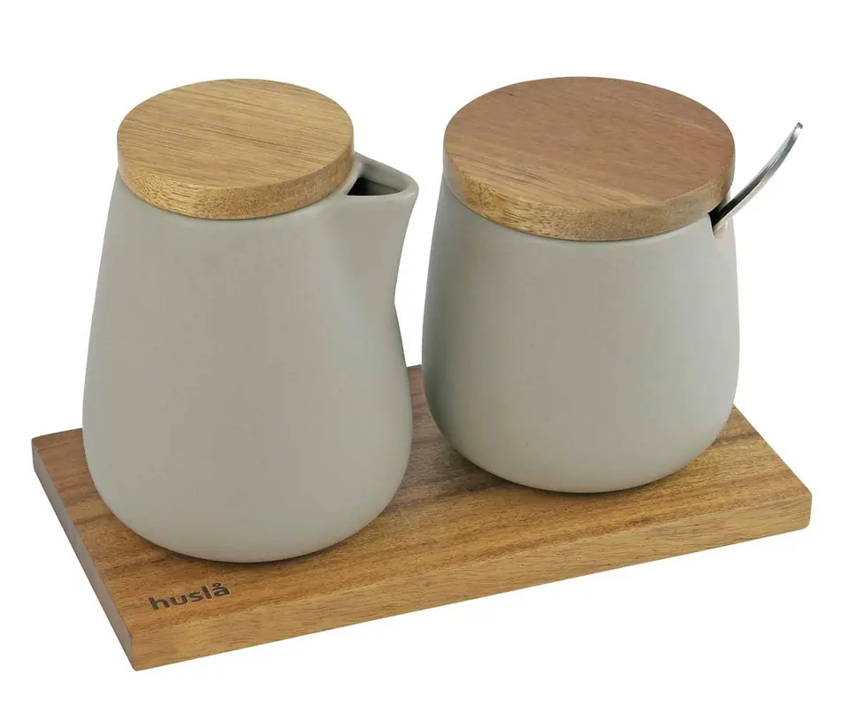 Ceramiczna cukiernica oraz mlecznik w kolorze ciepłym szarym z pokrywami wykonanymi z drewna bambusowego. W zestawie metalowa łyżeczka. Design zestawu świetnie skomponuje się z nowoczesnymi wnętrzami.