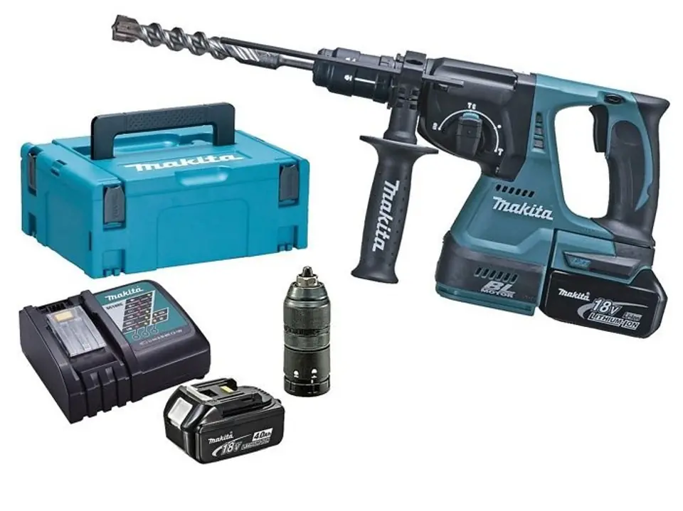 Profesjonalna akumulatorowa młotkowiertarka z szybkowymiennym uchwytem narzędziowym typu SDS-PLUS MAKITA DHR243 zasilany zasilany przez wydajne 18V akumulatory MAKITA z serii LXT.