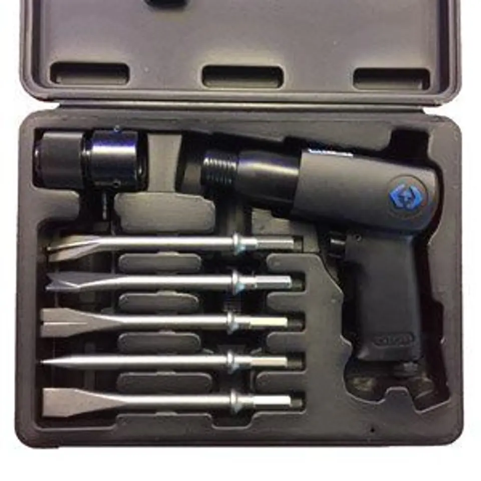 W zestawie - młotek pneumatyczny z uchwytem 10,2 mm - 5 .x dłuto z chwytem sześciokątnym - 2 x uchwyt (szybkiego zwalniania i ze sprężyną) - 1 x adapter wlotu powietrza. Długość całkowita: 175 mm. Wąż powietrza: 3/8"Ciśnienie powietrza: 6,2 bar. Ilość uderzeń (cykl/min) : 3000Średnie zużycie powietrza (l/min) : 187. Wlot powietrza: 1/4"Trzon dłuta: 10,2 mm. Waga: 1,7 kg"