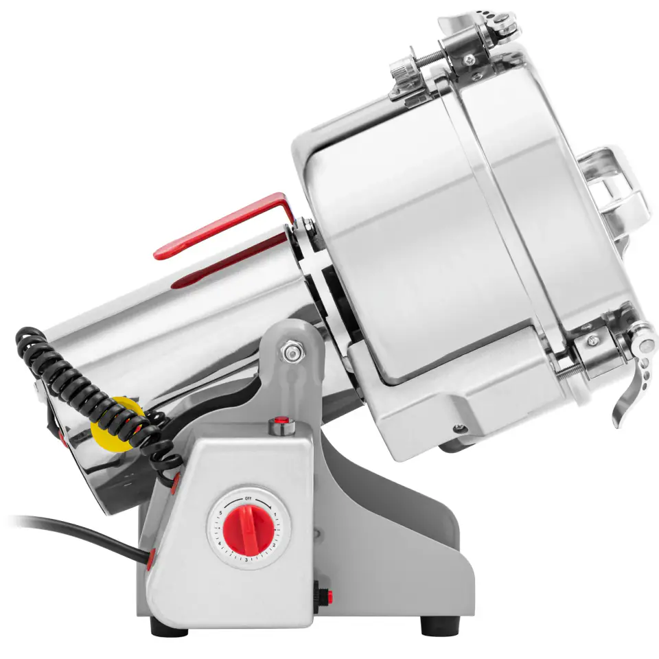 Kod producenta: 10012948Elektryczny młynek do przypraw marki Royal Catering to idealne narzędzie, jeśli chcesz szybko i precyzyjnie posiekać przyprawy lub zioła. Duża pojemność do 2000 g młynek do ziół nadaje się zarówno do użytku domowego, jak i komercyjnego. Silnik 3400 W napędza ostre jak brzytwa noże do 35000 obr./min. Dzięki temu w ciągu kilku sekund mielone są suche produkty, takie jak pieprz, orzechy, ziarna kawy lub laski cynamonu tak drobno, jak tylko chcesz. Wbudowany minutnik ustawiany jest za pomocą pokrętła w zakresie 0 - 5 minut. Ponieważ ten elektryczny młynek do przypraw ma dużą moc, większość produktów rozdrabnianych jest w 30 s. Tylko twardsze składniki potrzebują około 1 minuty. Można przechylić pojemnik o 270deg; za pomocą bocznego pokrętła i łatwo wysypać zawartość. Dwa solidne zatrzaski na pokrywie zapobiegają niezamierzonemu otwarciu podczas pracy i chronią przed urazami. Dzięki hermetycznej pokrywie z rączką w pojemniku możesz przechować świeżo zmielone przyprawy lub zioła. Zbiornik, ostrza i korpus wykonane są z odpornej na korozję stali nierdzewnej powszechnie stosowanej w gastronomii. Materiał ten gwarantuje długą żywotność elektrycznego młynka. Antypoślizgowe gumowe nóżki tłumią drgania i zapewniają stabilność. Chronią również powierzchnię roboczą przed zarysowaniami.Cechy produktu: